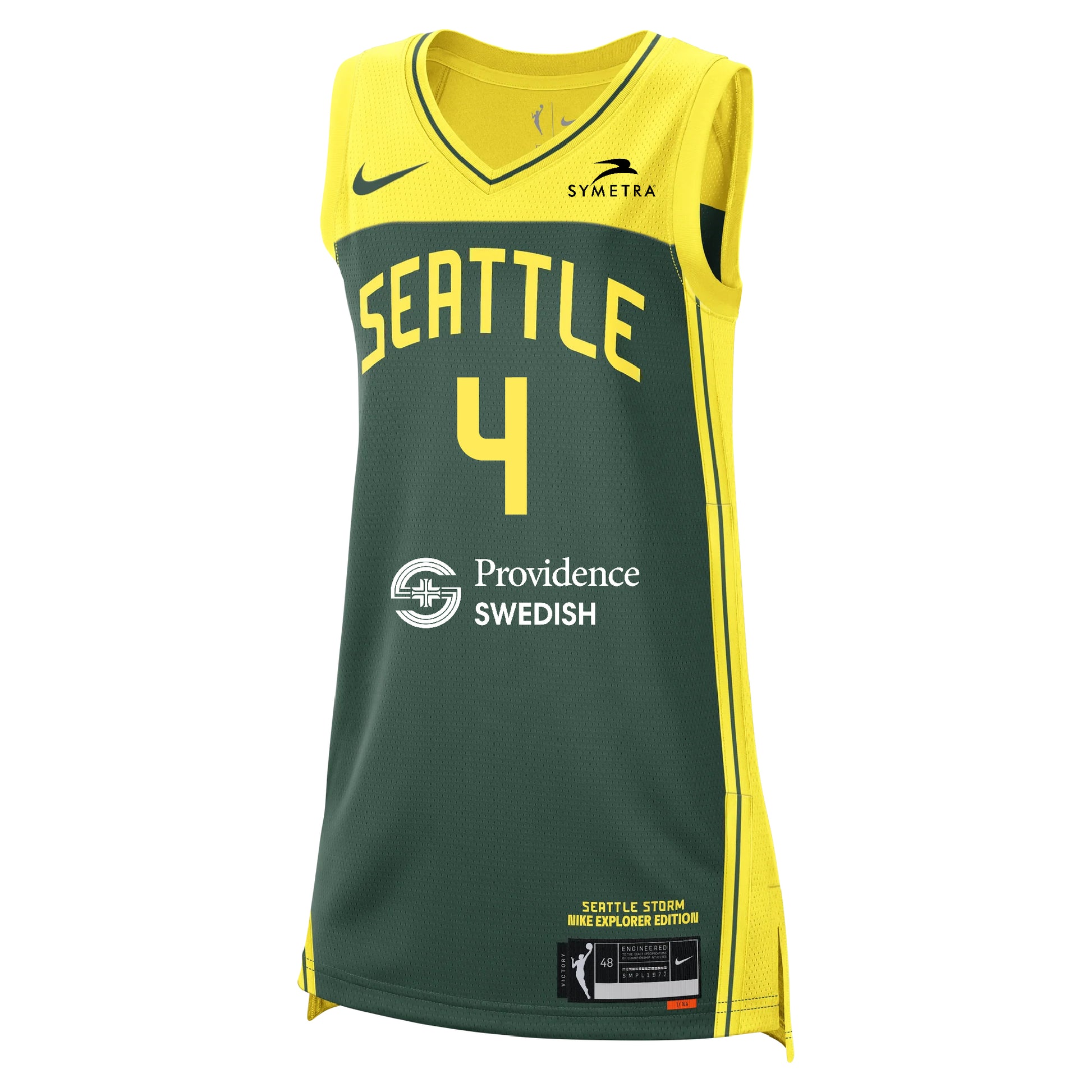 The Nike WNBA Explorer Edition Victory Jersey of the Seattle Storm represents the team's home connection. The jersey features Emerald City colors and design lines inspired by the Space Needle and Seattle's rich basketball history. Seattle is the Emerald of the Pacific Northwest. An evergreen crown jewel celebrated for its undamped spirit and unflappable energy. Just like the Space Needle, the uniform is a beacon of Seattle’s strength and fortitude. A symbol of the city’s optimistic outlook and go-getter better nature, the Seattle Storm Nike Explorer Edition uniforms feature a sweeping frame in yellow coupled with a spruce-green field.