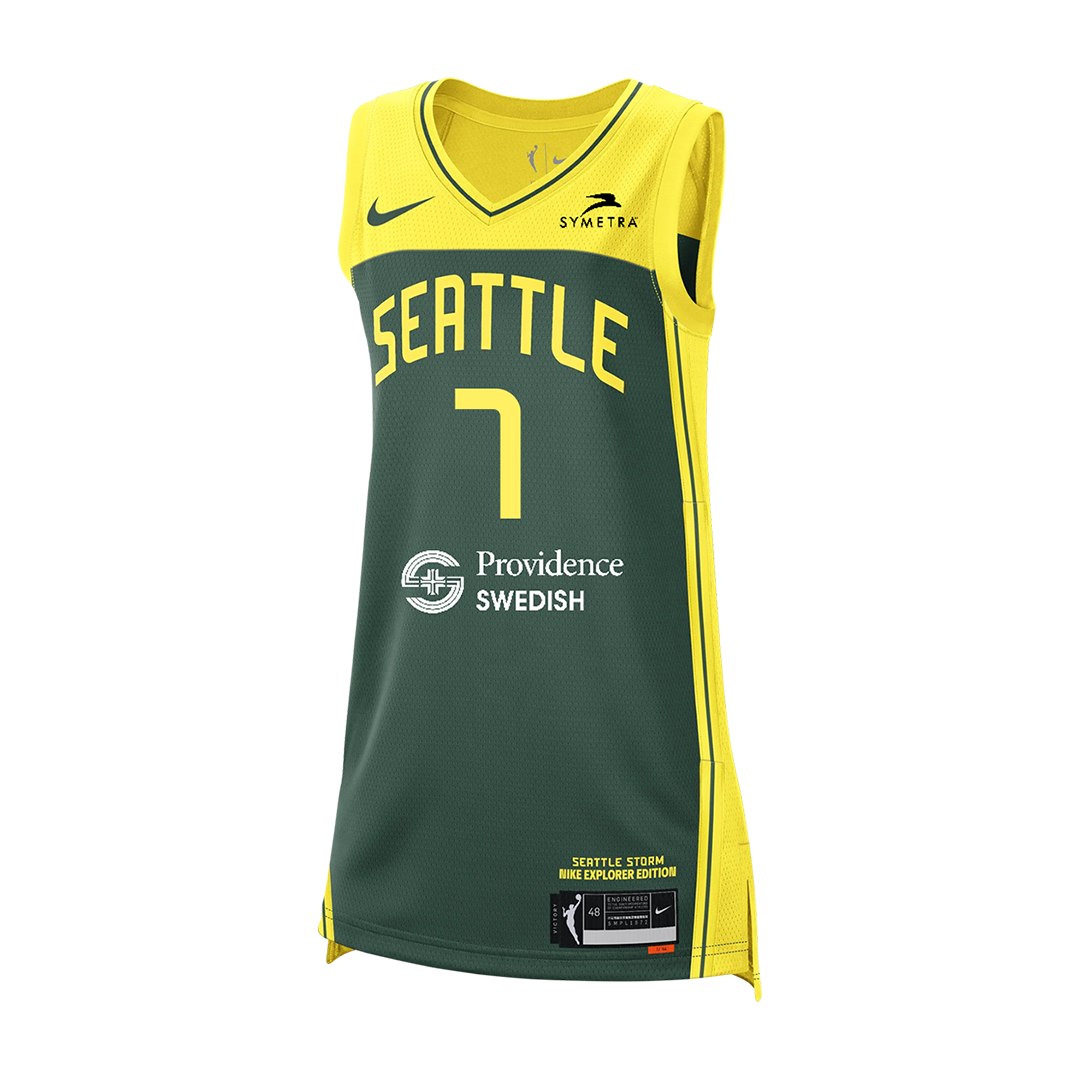 The Nike WNBA Explorer Edition Victory Jersey of the Seattle Storm represents the team's home connection. The jersey features Emerald City colors and design lines inspired by the Space Needle and Seattle's rich basketball history. Seattle is the Emerald of the Pacific Northwest. An evergreen crown jewel celebrated for its undamped spirit and unflappable energy. Just like the Space Needle, the uniform is a beacon of Seattle’s strength and fortitude. A symbol of the city’s optimistic outlook and go-getter better nature, the Seattle Storm Nike Explorer Edition uniforms feature a sweeping frame in yellow coupled with a spruce-green field.